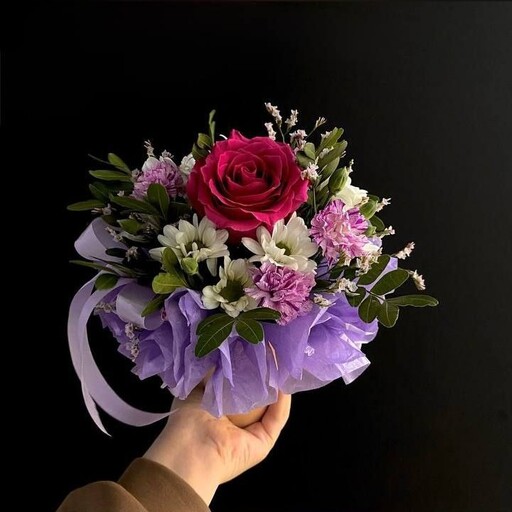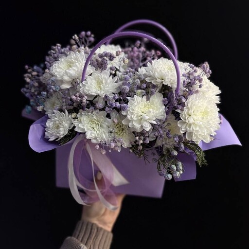 Элегантная цветочная сумочка с белыми хризантемами, нежной гипсофилой и акцентами в сиреневых оттенках. Оформлена в стильной фиолетовой упаковке с ручкой — удобно дарить и переносить. Изящные ленты дополняют утончённый образ. Идеальный подарок для ценительниц утончённой красоты.